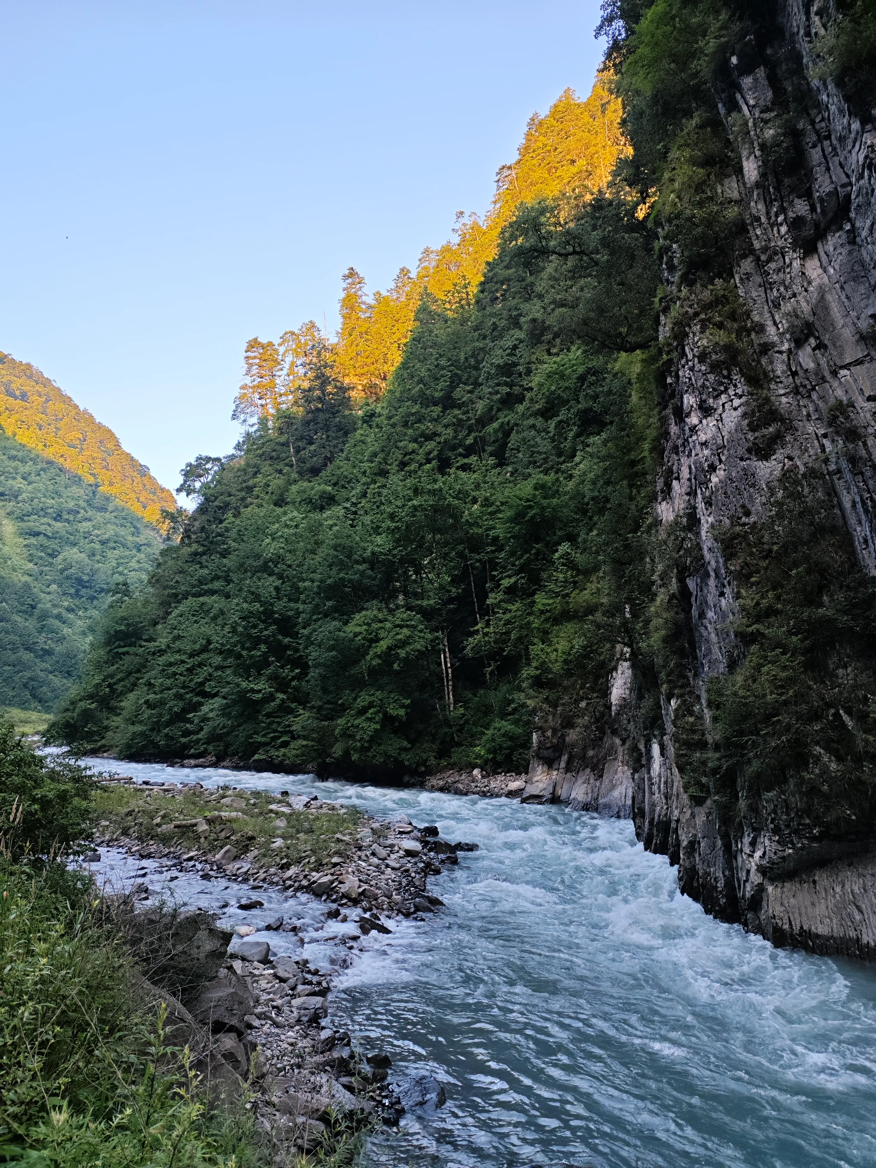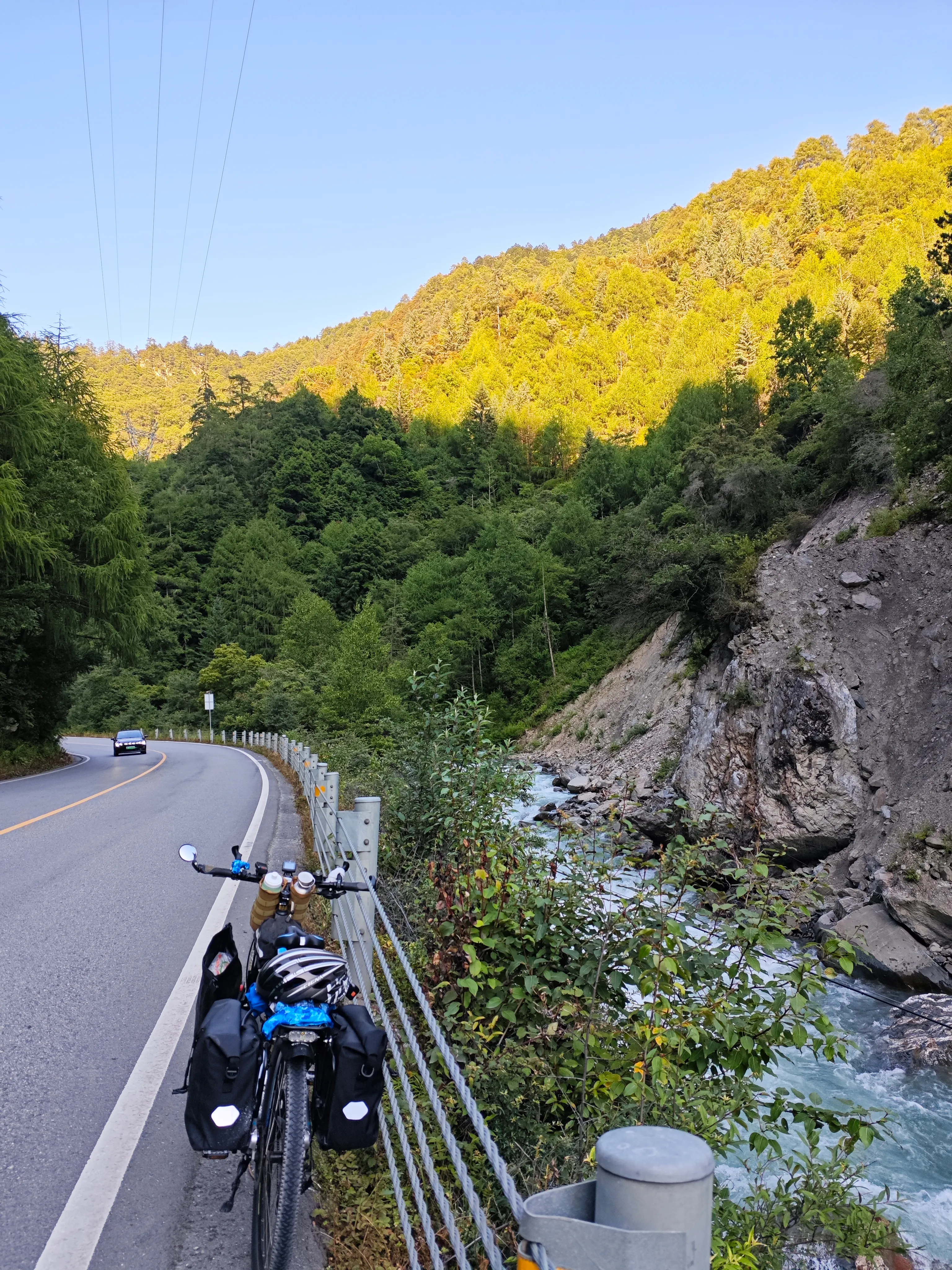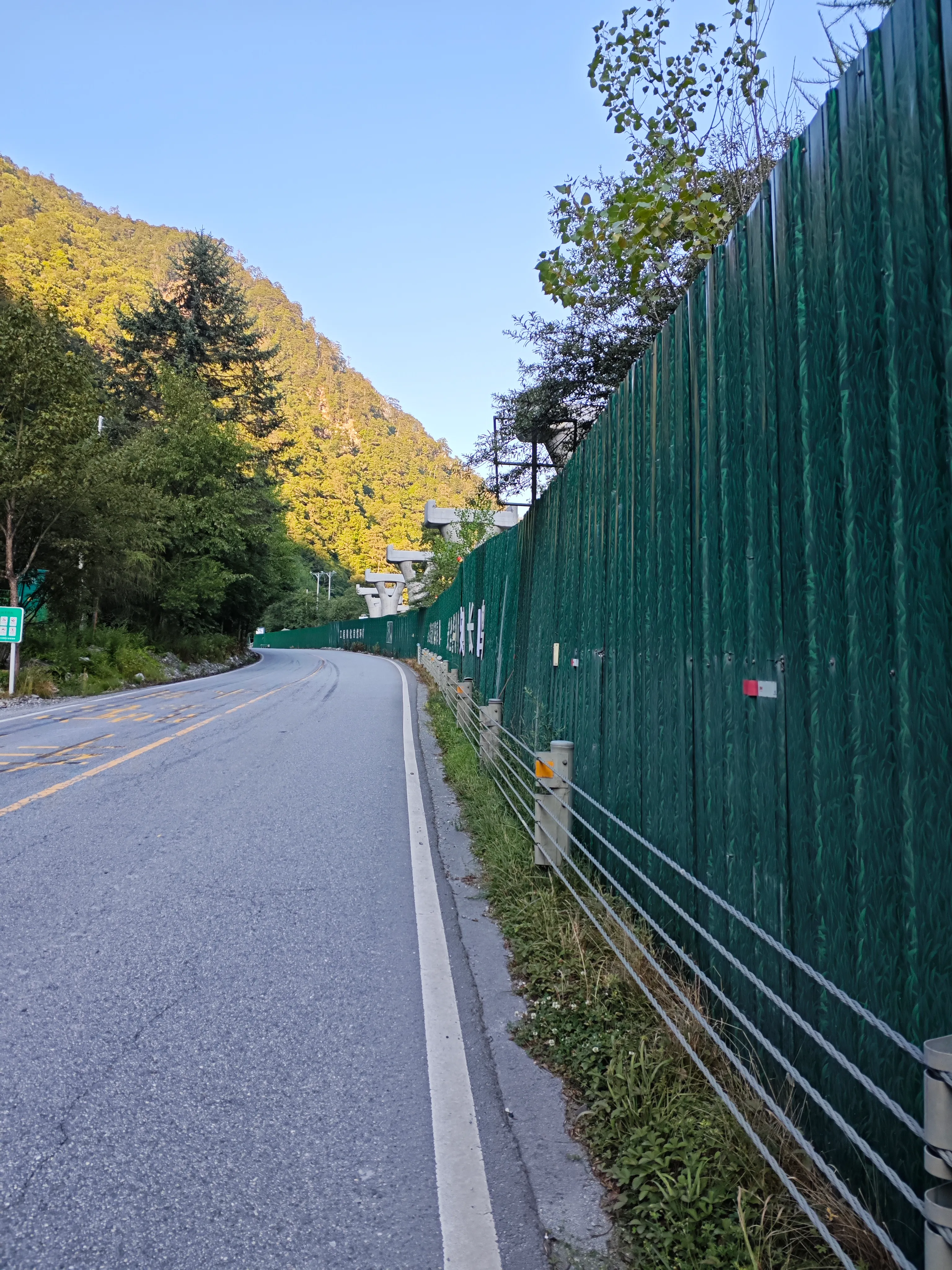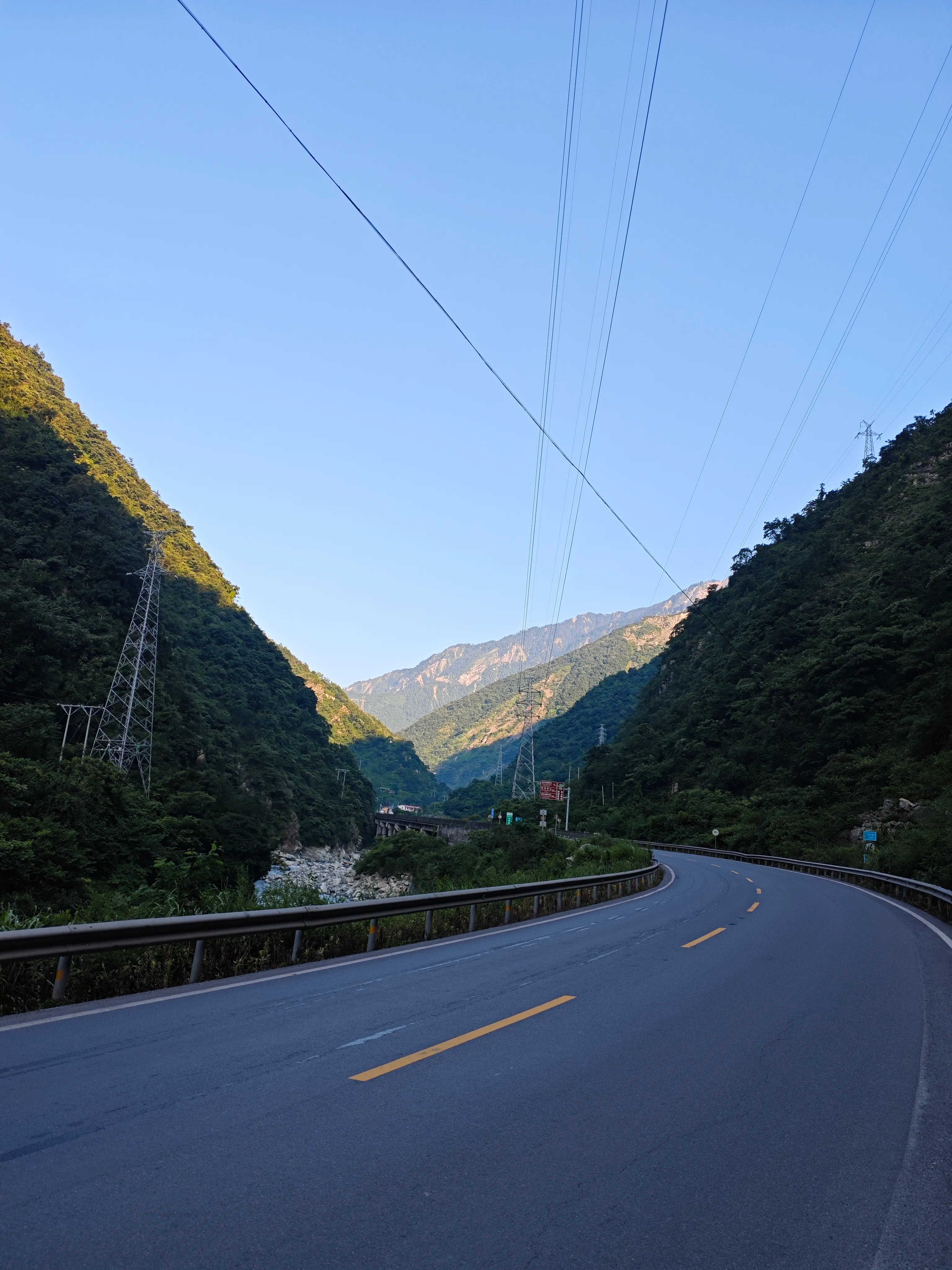 从熊猫沟出来一直沿着河骑行,时不时能看到日照金山。清晨骑行路上车很少。我还碰到了三个老头骑友,我估计他们骑的是电助力自行车,飞快的超过了我。