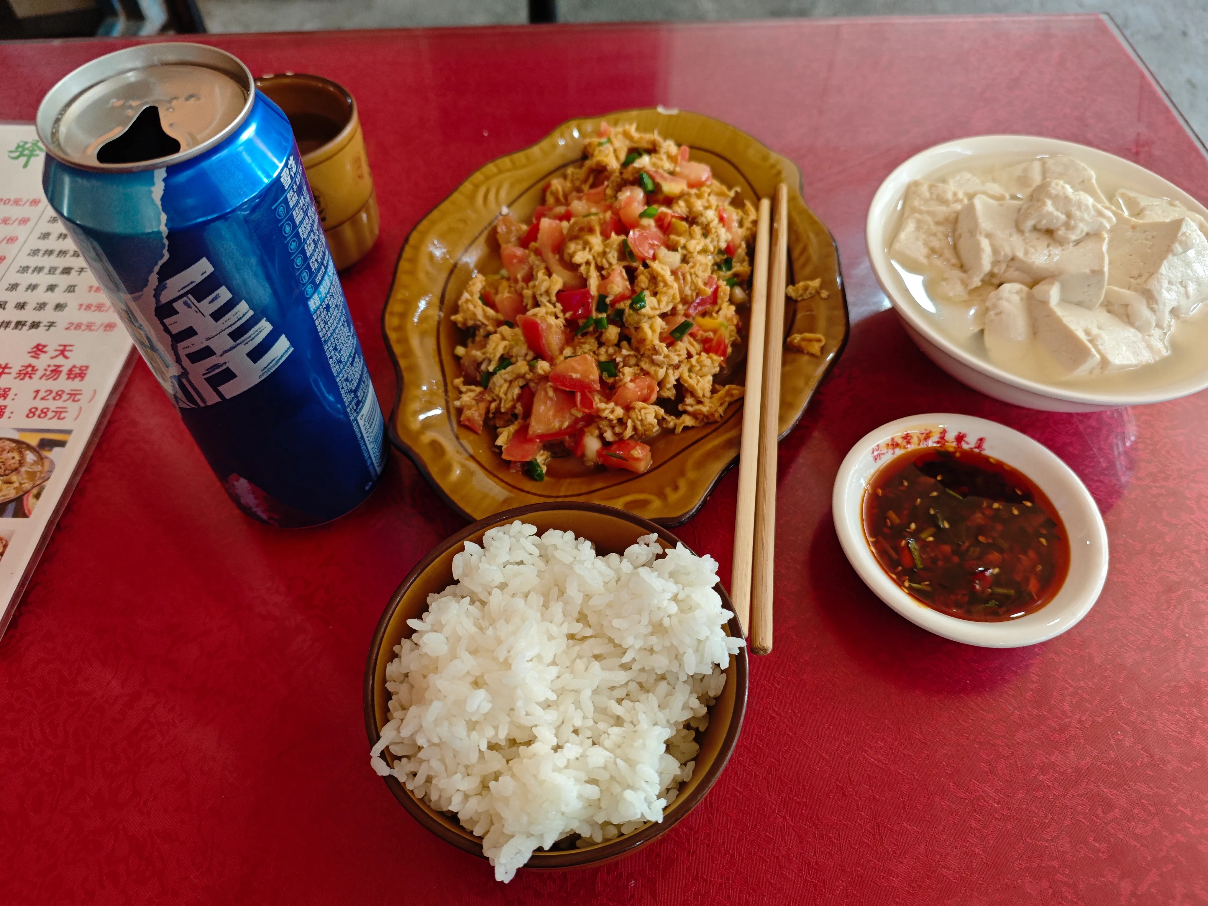 下午两点左右,差不多是最热的时候了,终于骑到了卧龙镇。感觉饿,但又由于太过炎热,食欲并不好。还是吃了个中午饭,西红柿炒蛋18元,豆花10元,啤酒5元。感觉山里面的炒菜略贵,带肉的菜至少30以上,但也没多离谱。