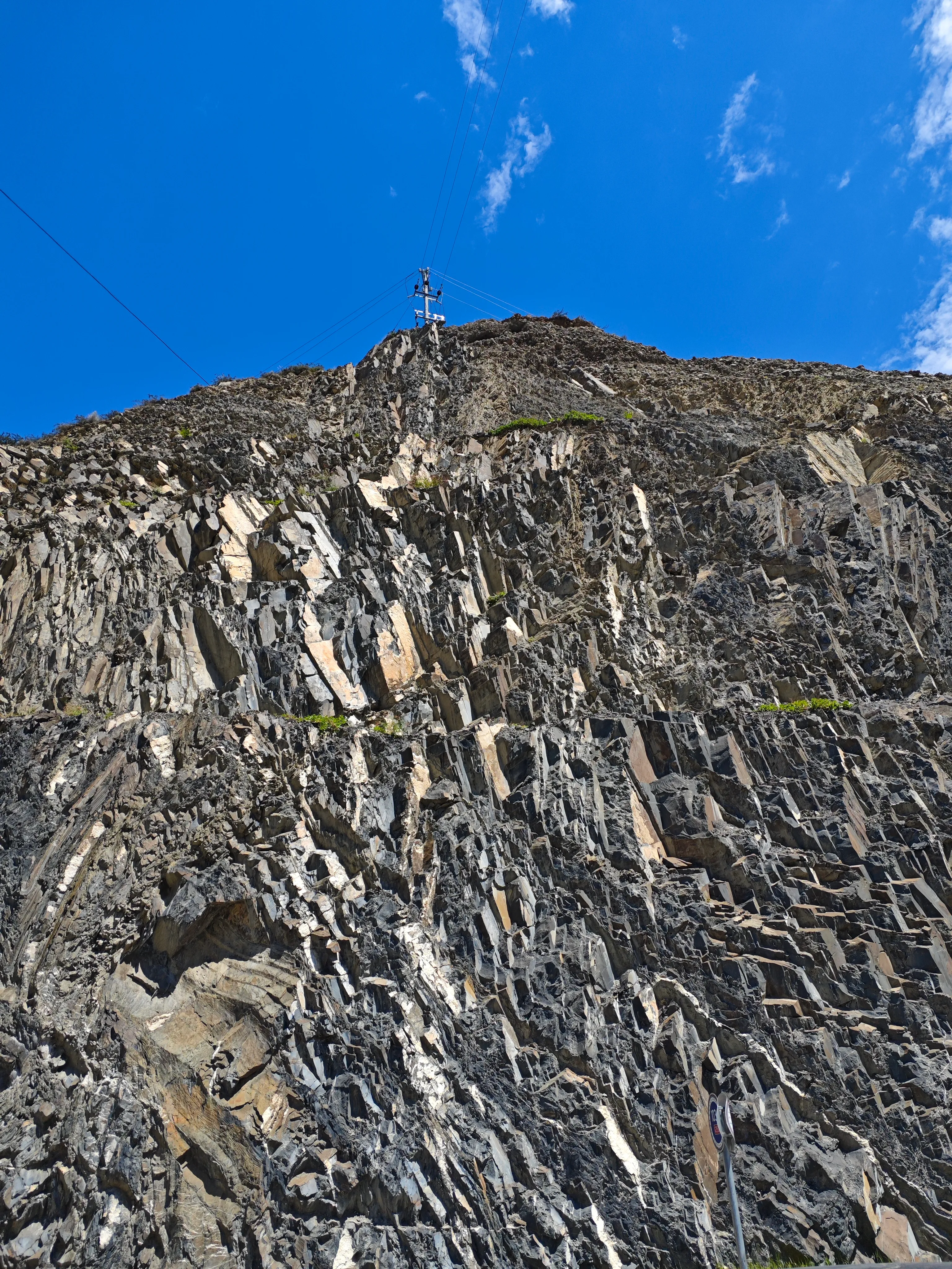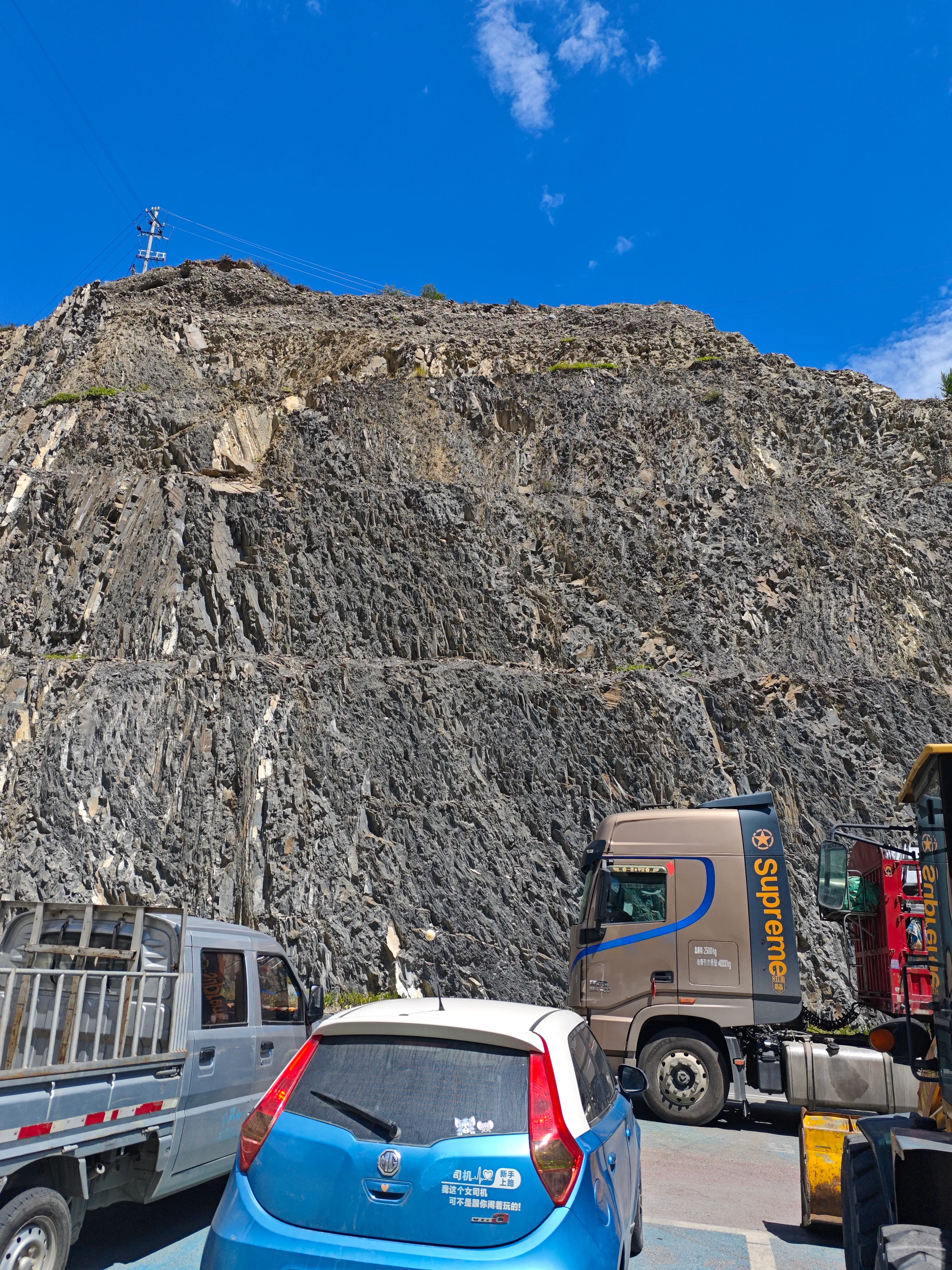 路上还碰到一次堵车,就是给这种山套上防护网。用粗大的钢丝把山体稳住。大块的石头可能会有点作用,小石头是防不住的。我看路上好多小坑,估计就是石头砸的。
