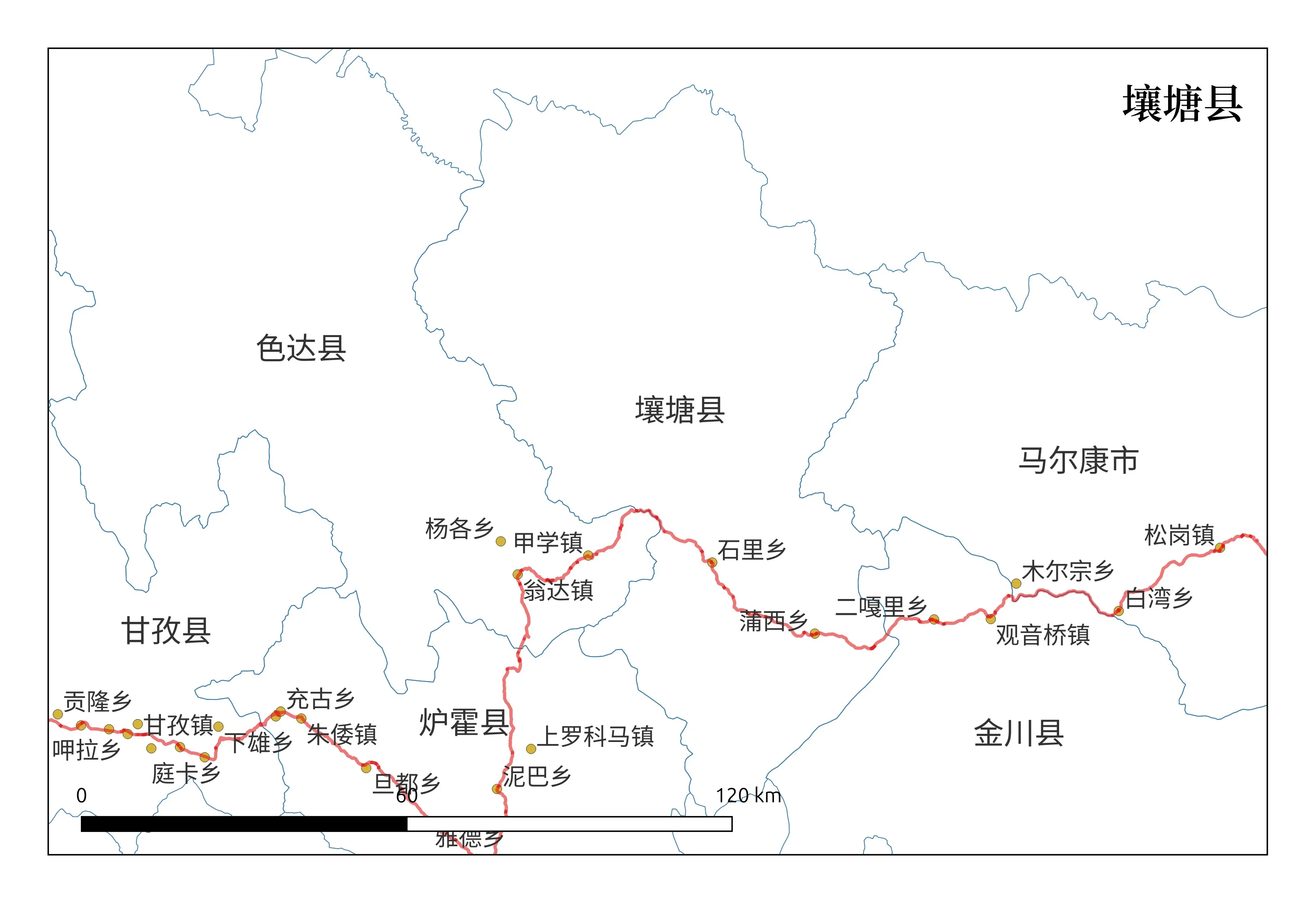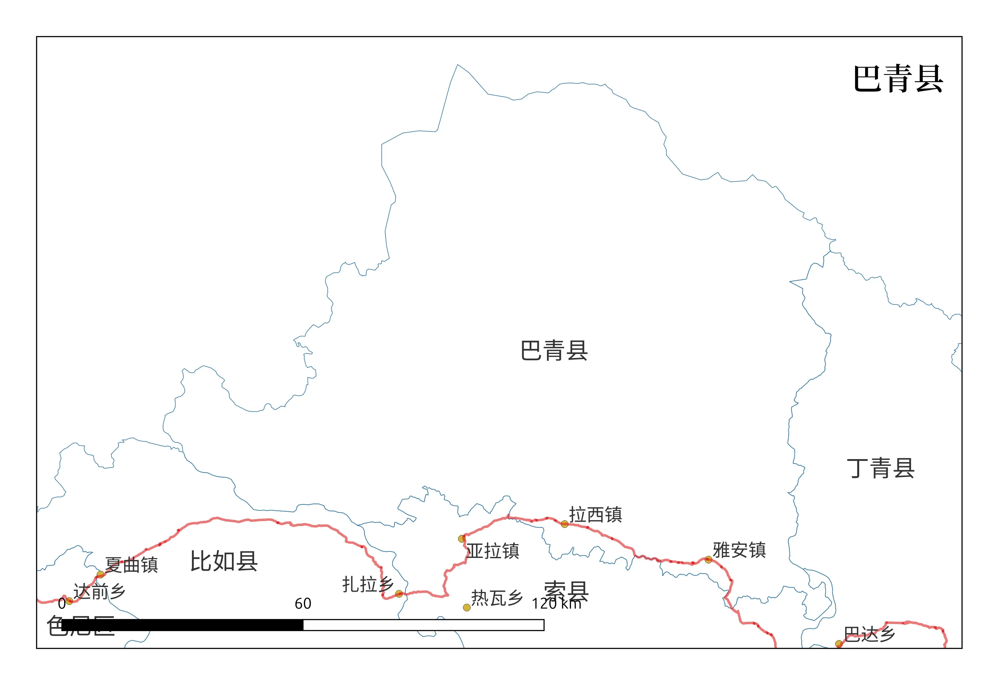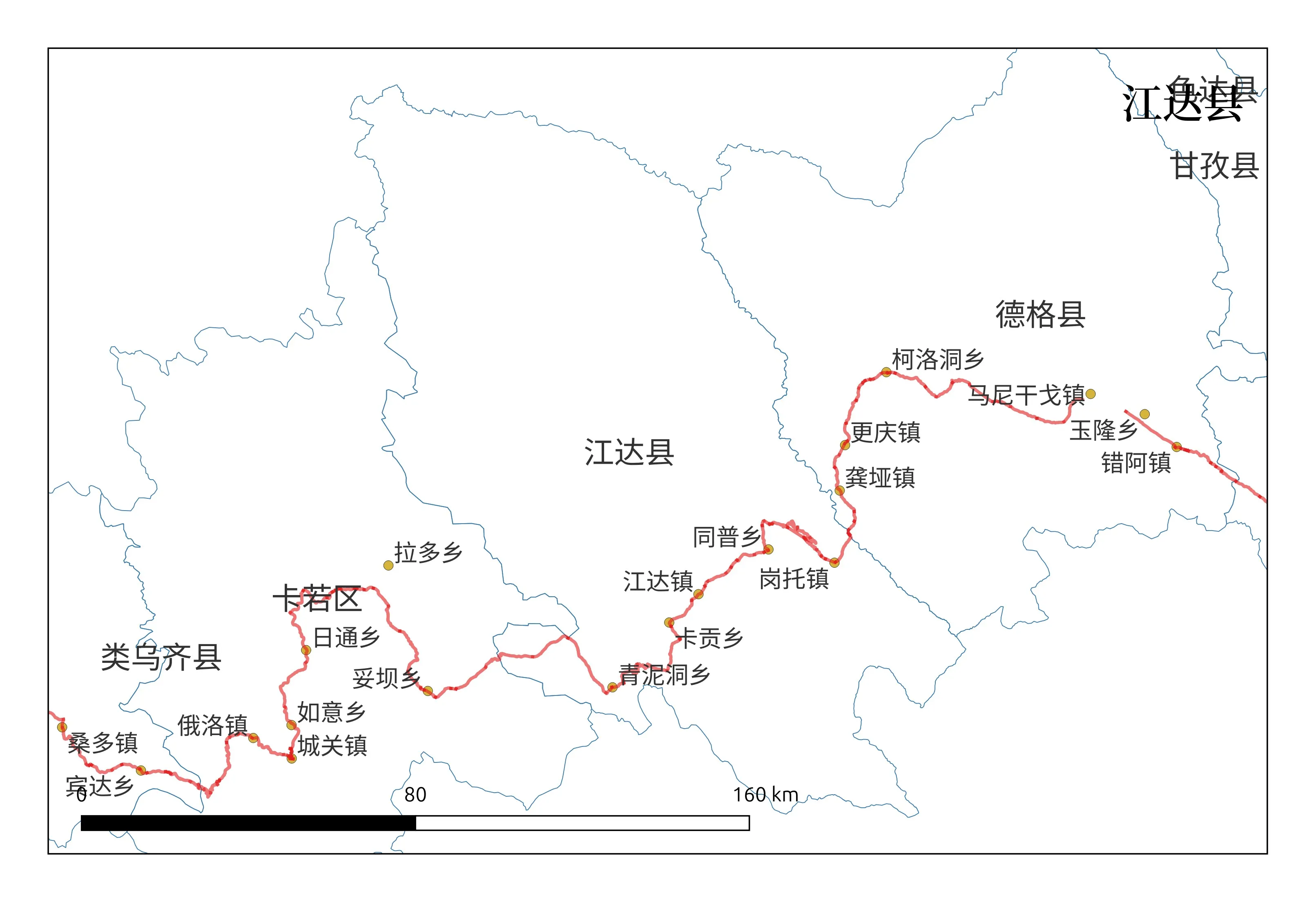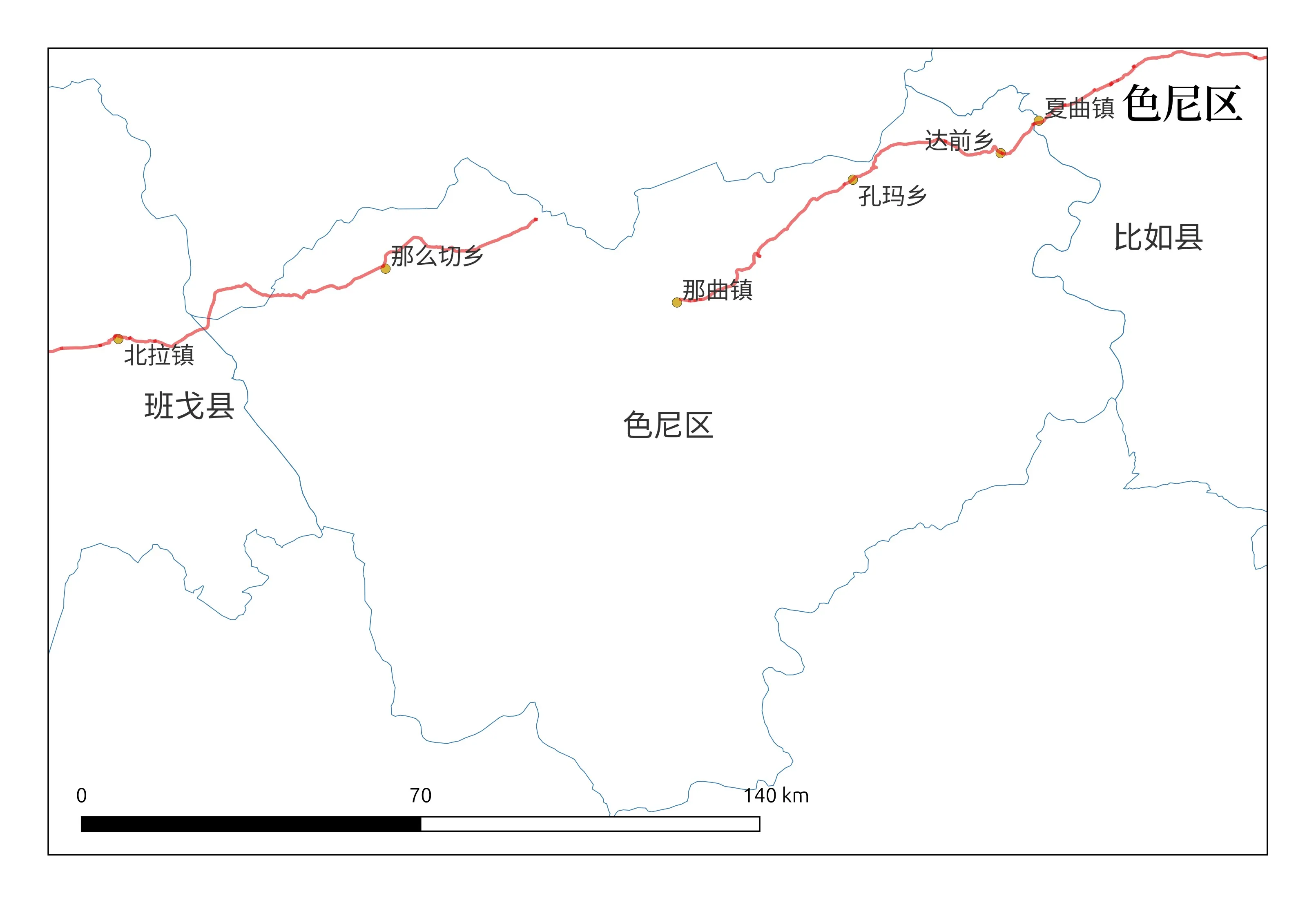 以下是按用qgis选择了路线10公里内的乡镇名称。在地图上,乡镇名称一般会标在乡镇的中心,一般也是最繁华的区域,但也不绝对。可以做为重要的参考。